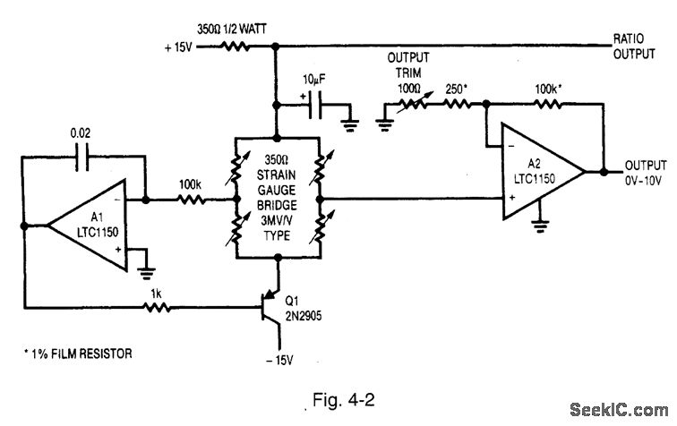 Figure 4-2 shows a way to reduce errors because of the bridge common-mode output voltage. A1 biases Q1 to servo the bridge left midpoint to zero under all operating conditions. The 350-Ω resistor ensures that A1 will find a stable operating point with 10 V of drive delivered to the bridge. This allows A2 to take a single-ended measurement, eliminating all common-mode voltage errors. LINEAR TECHNOLOGY, APPLICATION NOTE 43, P. 5.