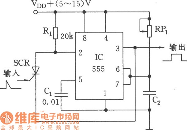 As shown in the figure, 555, R1, RP1, C2 and some other components constitute the trigger delay circuit. Commonly, 555 is in the state of reset , and feet 3 displays a low level since R1 is connected with VDD; When triggered signals come in , SCR will break over ,feet 2 will have a low level signal which will turn 555 to output a high level. The temporary stable width is: τ = 1.1 RP1C2 . After triggering, SCR will shut off. This circuit can lower the requirement of triggering pulse. If CMOS type 555 (or 556) is used, the triggering current can also be reduced.