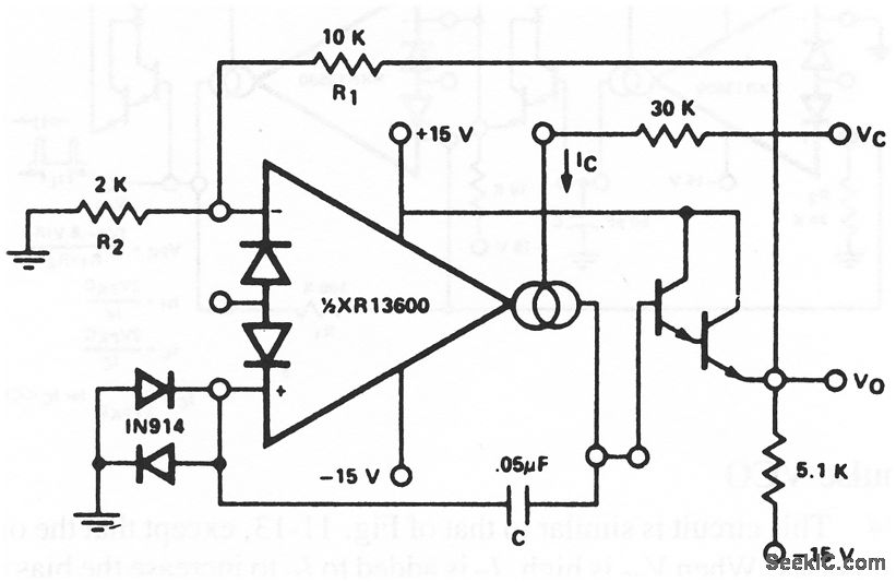 This circuit uses only one section of an XR-13600 (Fig.11-1B) to form a VCO. The remaining section can then be used for another purpose. EXAR Corporation Databook 1990 p 5-255