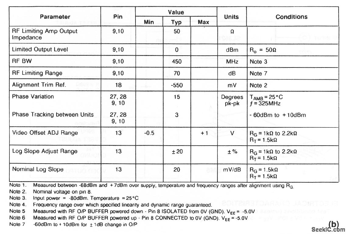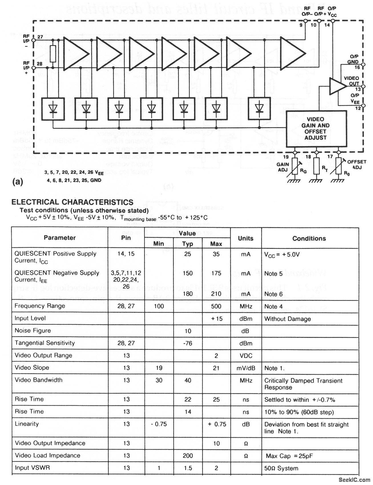 The SL3522 used in this circuit is a 7-stage successive-detection log amp IC for use in the 100- to 600-MHz range. The IC features an on-chip video amplifier with provision for extemal adjustment of log slope and offset, as well as a balanced RF output. Figure 2-2B shows the electrical characteristics. Compare this single-chip circuit to that of the multi-chip amplifier in Fig. 2-1.