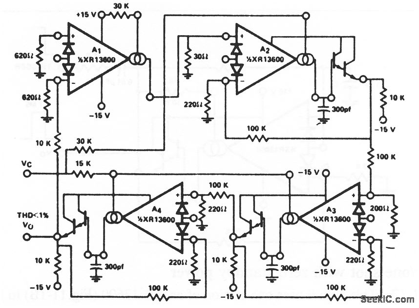 This circuit amplifiers configured as uses two XR-13600 OTAs (Fig.11-1B) , with three of the amplifiers configured as low-pass filters and the fourth as a limiter/inverter. The circuit oscillates at the frequency, where the loop phase-shift is 360° or 180°for the inverter and 60° per filter stage. This VCO operates from 5 Hz to 50 kHz with less than 1 % THD. EXAR corporation Databook, 1990 p 5-255