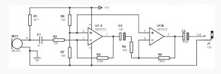 The mic pre amp described here is designed to connect a small electret microphone and uses an integrated circuit type NE5532.