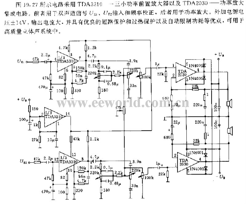 The circuit shown in Figure 19.27 uses low-power preamplifier TDA3310 and TDA2030 power amplifier integrated circuit. The former is used for the dual-channel UE2 and UE2 input and frequency correction, the latter is used for power amplification. External power supply voltage is ± 14V, output current is high, and it has the features of excellent short-circuit protection, overheating protection and automatic limit power consumption, so it can be used in high-quality stereo system.