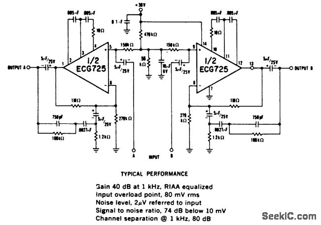 Stereo phono AF preamplifier with RIAA equalization. Gain is 40 dB at 1 kHz with the input overload point set at 80 mV RMS. Noise level is 2 μV referred to the input. Signal to noise ratio is 74 dB below 10 mV. Channel separation at 1 kHz is 80 dB (courtesy GTE Sylvania Incorporated).