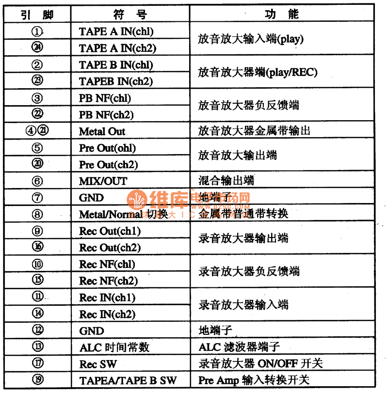 TA8149N is a recording,playback preamplification integrated circuit produced by Company TOSHIBA and used in double card machine,it is applied to the homemade and import music center widely.1.inner circuit and function of pins TA8149N integrated package includes two recording,playback preamplification circuits of same functions,metal tape/normal tape electronic switching convertion circuit,card A and card B electronic switching convertion circuit,ALC control circuit,power supply and bias voltage circuit.The inner circuit and typical application circuit are shown as picture 1.This IC adopts dual inline 24 pinned package,the functions of pins are shown as chart 1.