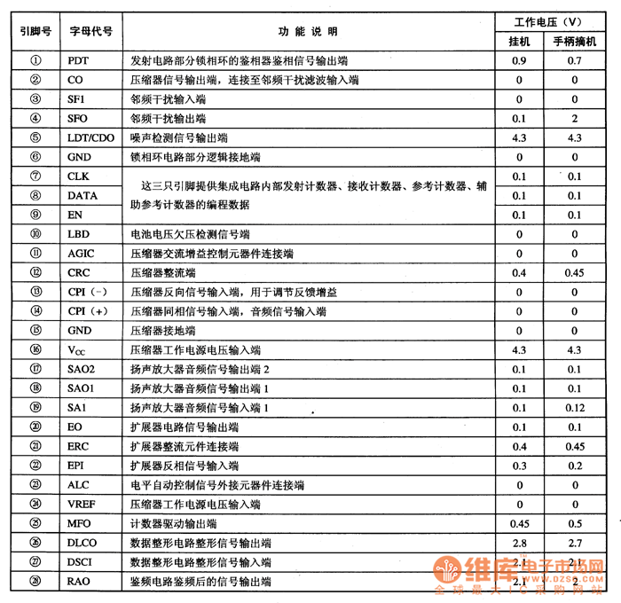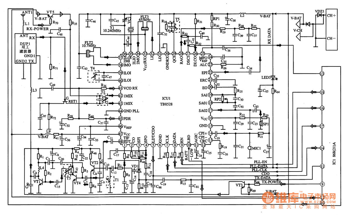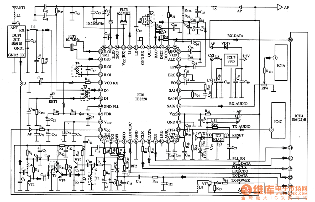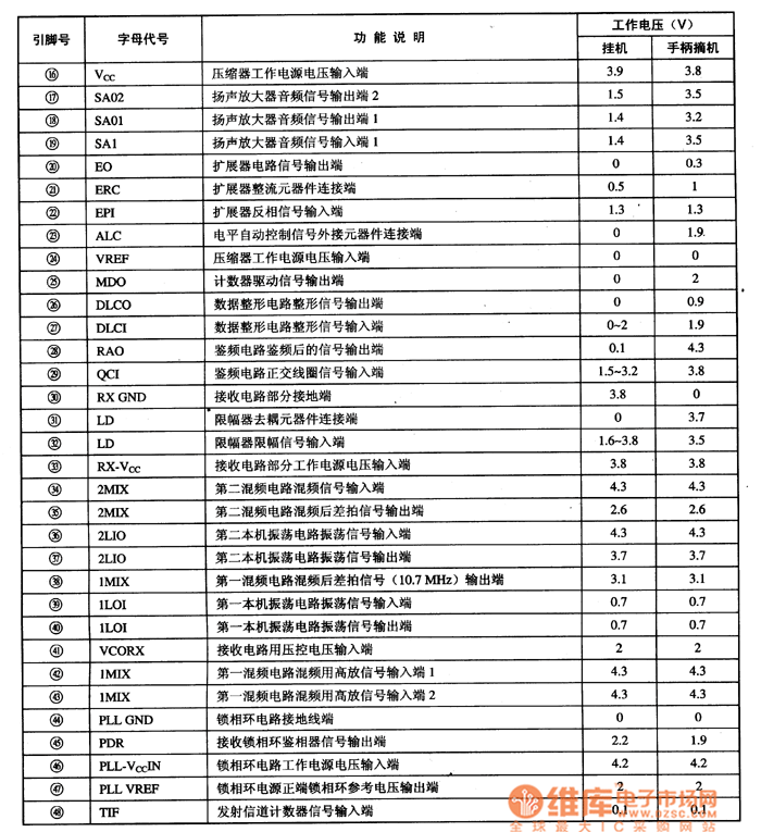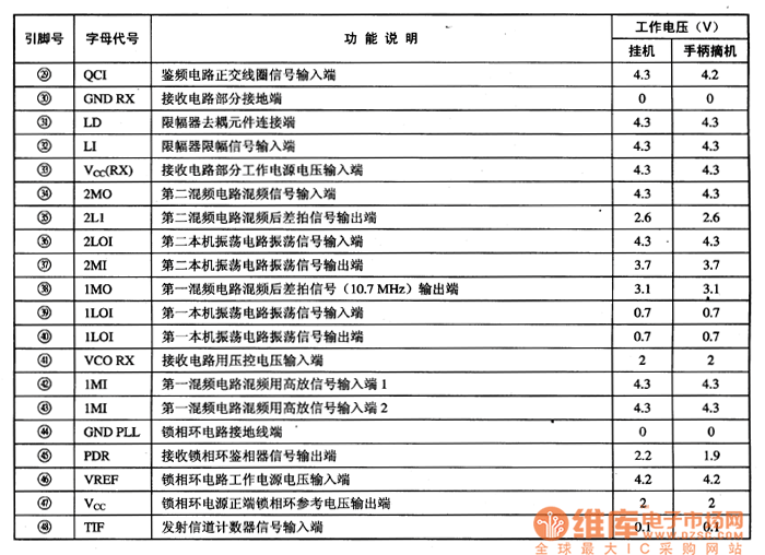 TB8528 is a communication RF compound integrated circuit produced by Toshiba, which is widely used in all kinds of wireless phones, and it is often used with cell phone control circuit as the main machine.1.function featuresTB8528 includes the emitting/receiving signal process circuit, PLL signal process circuit, audio compressing/expanding circuit, double-conversion process circuit and so on, which is used to complete receiving modulation, PLL control, language compressing/expanding process and other functions.2.pin functions and dataTable 1. The pin functions and data of the host RF compound integrated circuit