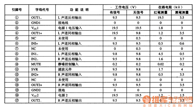 TDA8944J is two-channel BTL audio power amplifier integrated circuit produced by Philips company, it is widely used in various high-fidelity home theater, television, stereo, computer audio. 1. Function descriptionTDA8944J IC has two BTL audio power amplifier circuits with the the same function, it also has a switch function of static noise, and thermal protection, short circuit protection circuit. When the working voltage is 12V, RL = 8Ω, each channel output power is 7W. 2. IC pin functions and data TDA8944J uses 17-foot single-line package, the pin functions and data are listed in Table 1. Table 1 shows TDA8944J pin function integrated circuit and data.