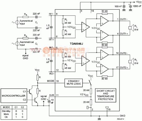 TDA8946J is a dual audio power amplifier, which contains two BTL amplifier circuits. When the power supply voltage is 18V, the load is 8 ohms, it can output 2 X 15W effective power. TDA8946J is packaged with ZIP dual in-line with the power supply range in 6 ~ 25V. THD total harmonic distortion is 0.03 0.1. 1. negative output terminal; 2. ground; 3. supply voltage VCC1; 4. output terminal; 5. empty; 6. the input signal; 7. empty; 8. input 1 is negative; 9. signal input 2 is negative; 10 . squelch control (alternate); 11. ripple rejection (external connected 10nF capacitor to ground); 12. signal input 2 is positive ; 13. empty; 14. output terminal 2 is negative; 15. ground; 16. power supply voltage VCC2; 17. output Terminal 2 is positive.