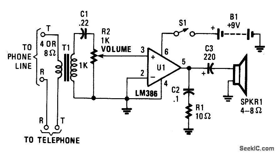 http://www.seekic.com/circuit_diagram/Amplifier_Circuit/TELEPHONE_SPEAKER_AMPLIFIER.html