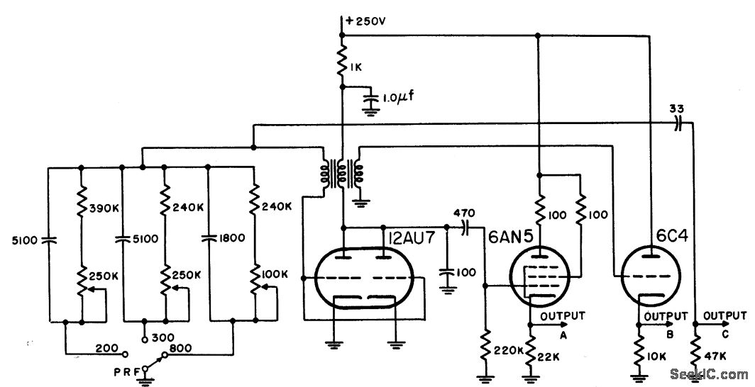 http://www.seekic.com/circuit_diagram/Amplifier_Circuit/THREE_OUTPUT_PRF_GENERATOR.html