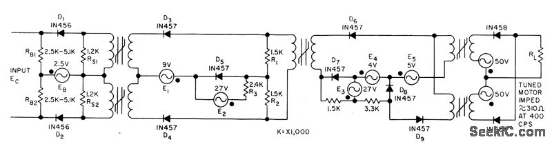 Has balanced two-core input, alternate-firing output stage, and synchronous interstage switches to eliminate interaction between stages.Power gain approaches 60 db. Zero drift is less than 0.25 deg, accuracy is within 0.5deg, and follow-up rate is 300 deg per sec.-C. C. Voice, Magnetic Amplifier Drives Gyro Indicator, Electronics, 31:7, p 114-117.
