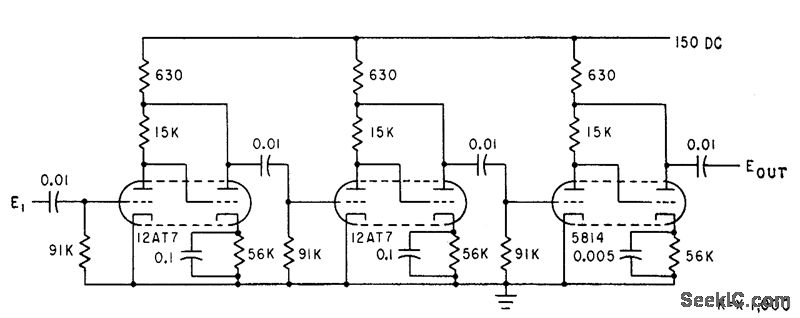 Handles closely spaced negative pulses in radar beacon and similctr applications, with-amplifier stctge is inverse-feedback pair of triodes with out distortion and recovery problems.Each amplifier stage is inverse-feednback pair of triodes with 360 ° total phase shift.-R. E. Koncen, Wide-Range Multiple-Pulse Amplifier, Electronics, 33:38, p 78-81.