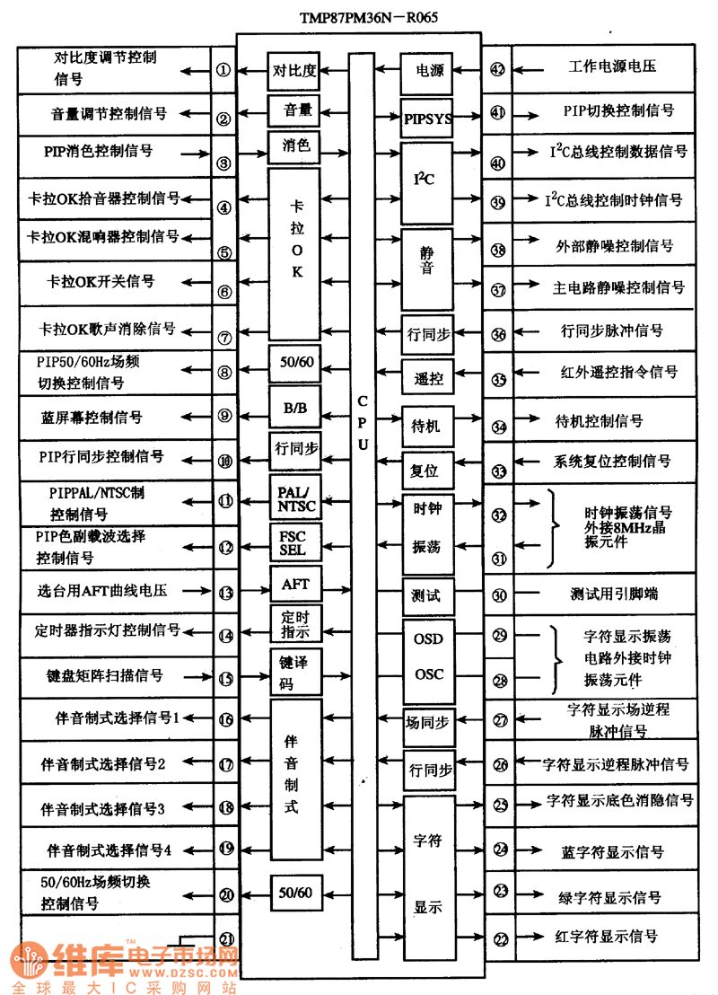 TMP87PM36N-R065 is mainly composed of the central processing unit (CPU), clock oscillator circuit, the reset control circuit, remote command signal processing circuit, the key bits command signal decoding circuit, I2C bus control circuit, audio format control circuit, the screen display characters signal generation and processing circuit, and other control and ancillary functions circuits, the internal circuit block diagram is shown as the chart.