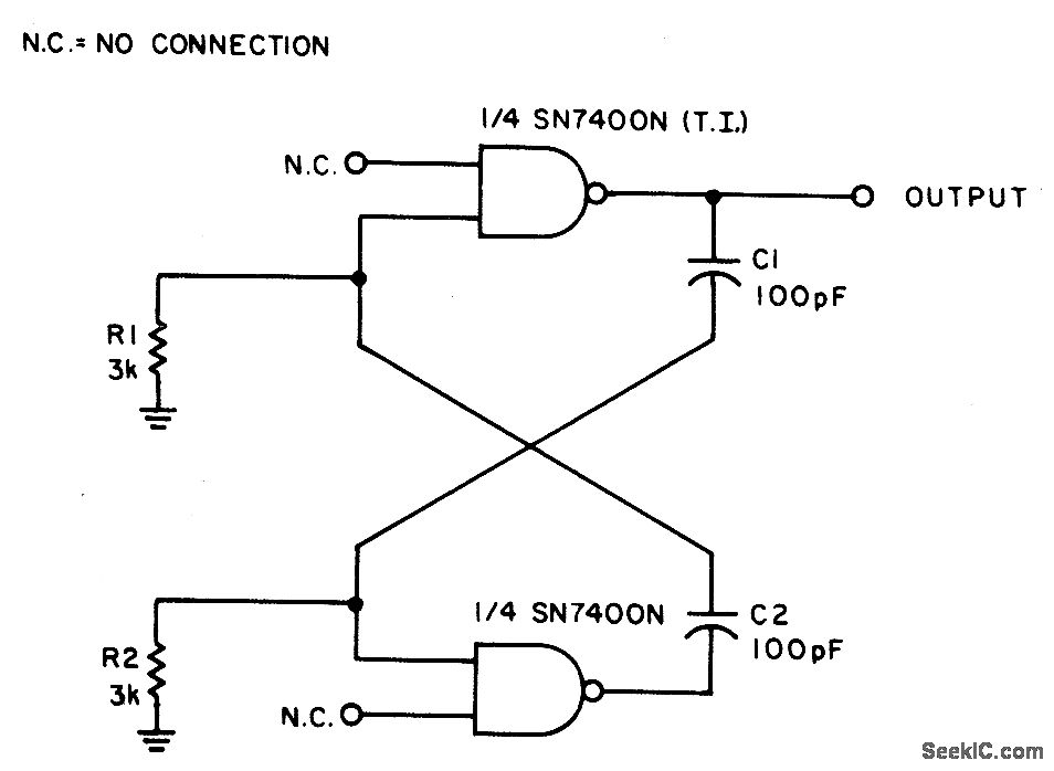 With the values shown the circuit generates a 2-MHz symmetrical square wave. Changing capacitors C1 and C2 to 0.01 μF results in a frequency of 500 Hz. For the particular integrated circuits and power supply voltages (5.0 V), the reliable operating range of R1 = R2 is 2 k ohm to 4 k ohm.