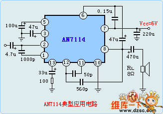 When Vvv=6.0V,THD=10% and RL=8Ω, the output power of AN7114 is 0.6W, the noise output is 3mV.Limit parameters: Vcc=11V, cooling power (without radiators) is 1.2W, which is 2.25W with radiators. The working temperature is -20—70℃, it is suitable for portable radios and stereo equipment as the power amplifier.