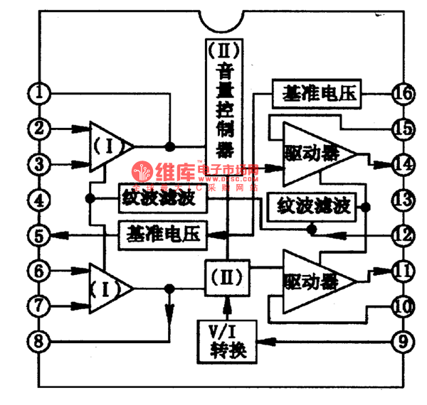 CXA1OO5P is a single chip stereo playback integrated circuit produced by Sony, which is used in ultra-small radios.1.the internal circuit and pin functions of CXA1OO5P CXA1OO5P is manufactured in dual-pole craft, which includes the preset balance amplifier, DC volume control circuit, headphone power drive stage and other function circuits. The internal circuit of the chip is shown in figure 1. The IC is in 16-pin dual in-line package, whose pin functions and data are listed in table 1.