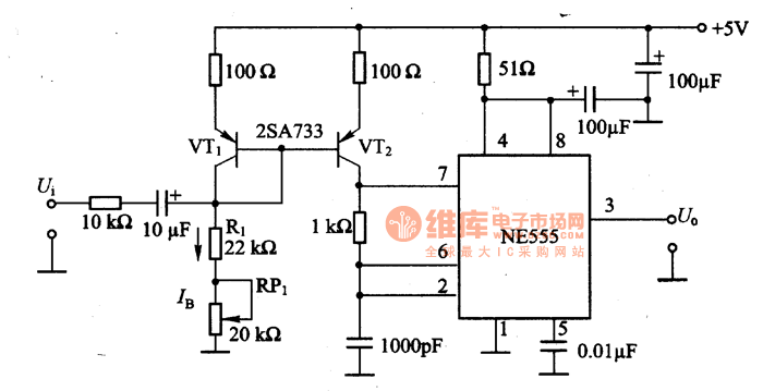 The FM circuit composed of the NE555 is as shown in the figure. By changing the charging current of the NE555 self-excited multivibrator, we can do the frequency modulation. This circuit is the current mueller circuit that is composed of VT1 and VT2, and it can produce the charging current in the charging circuit, the current is decided by R1 and RP1. The low frequency modulation signal and the offset current IB are overlied to make the oscillation frequency change. The current mueller circuit need to use the geminate transistor.