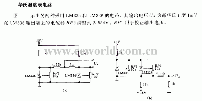 In the figure, there are two kinds of LM335 and LM336 circuit, whose output voltage UA is 1mv/1F.The potentiometer RP2 on the output terminal of LM336 is adjusted to 2.554v, and RP1 is used to adjust the output voltage.