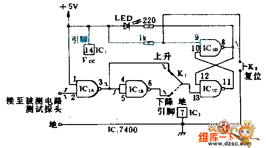 The RS flip-flop which is composed of the NAND gates can detect the narrow pulse, and the narrowest pulse width is the total delay time (about 30ns) of the flip-flop's two NAND gates. When the pulse appears, the circuit will change and the LEDs display the output state of flip-flop. You must use the K after detecting the pulse; By resetting the circuit and according to the choice of K1, this circuit can response the positive pulse or negative pulse.