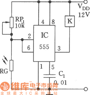 See as the figure, the circuit is based on 555, and 555 with LDR RG and RP1 composes the circuit. The resistance of RG changes with the light, by using the resetting and offsetting feature of the 2 comparators in 555, the Schmidt trigger is formed. When the light is strong, RG is in a low resistance, 2-pin is in low LEV(<1/3 VDD), 555 is offset, K is still; when the light is weak, RG is in a high resistance, 6-pin LEV is higher than 2/3VDD threshold LEV, 555 is reset, K is pulling in.