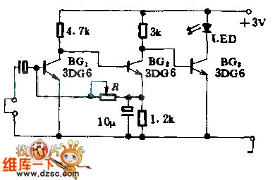 This circuit is composed of the sound source amplifier and the LED driving circuit. The microphone is used as the voice detector to change the voice signal into the electrical signal and this electrical signal is amplified by BG1 and BG2 to drive BG3 to turn on the LED.