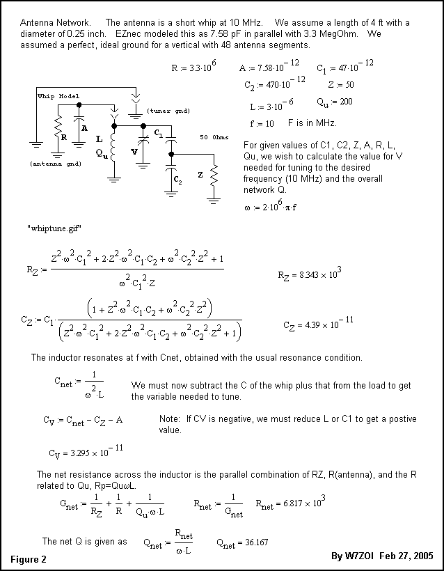 Previous experimentation confirmed that it is easy to tune a short whip antenna by connecting it to the hot end of an L C (inductor and capacitor) tank circuit. The high impedance whip antenna was matched to a JFET RF amplifier by placing a high value (1 megohm or greater) on the JFET gate to ground. Although this method is practical, I desired a network to transform the output impedance of the tuned whip tank tank circuit to a known impedance. I do not possess the knowledge or mathematical skill to design such a network and asked Wes Hayward if he might consider doing this for me. My desired parameters for the network were 10.0 MHz, a 50 ohm output impedance and a 4 foot (122 cm) whip. Please refer to Wes' calculations and schematic in Figure 2 below. This math is difficult, however, a practical design for experimentation is provided.