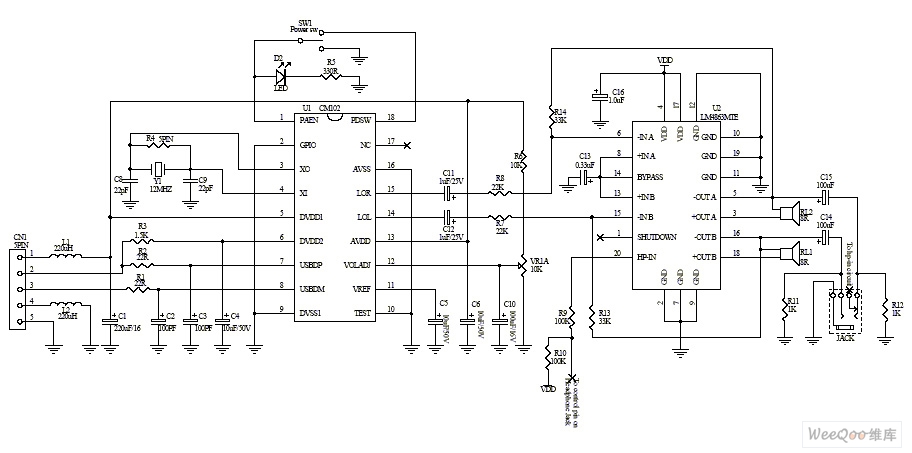 The USB multimedia 2.5W+2.5W voice box design circuit is shown as above.