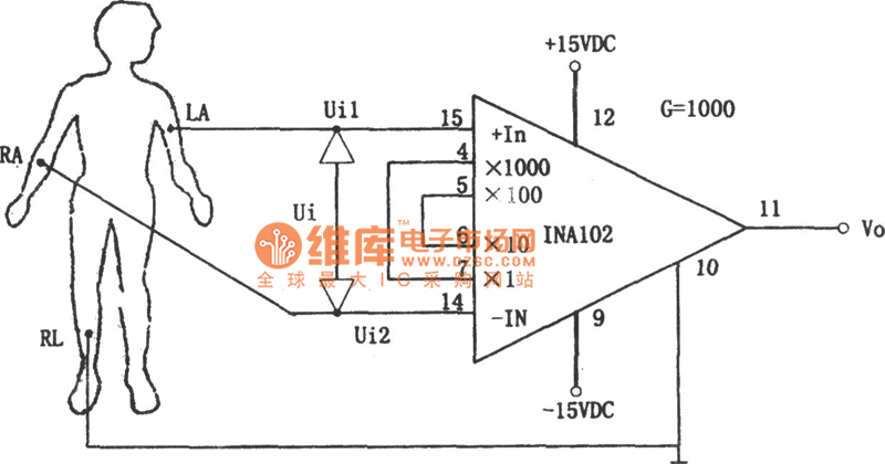 The figure shows the biological signals preamplifier circuit. They need to measure the biological electrical signals of the human body in the medical instrument, such as the electrocardiogram, eeg, etc. Due to the creatures signal is weak, the requirements of the amplifier circuit is very high. This circuit chooses the low power consumption meter with the integrated op-amp INA102. The features of the integrated chips INA102 are: Static current small (maximum is 750 mu A); The internal gain can pass the tube feet and change, the different connecting choice of gain is: l, 10, 100 and 1000 in the photo, pins 4 and 7 are connected with 5, and 6 pins and get the biggest gain 1000.