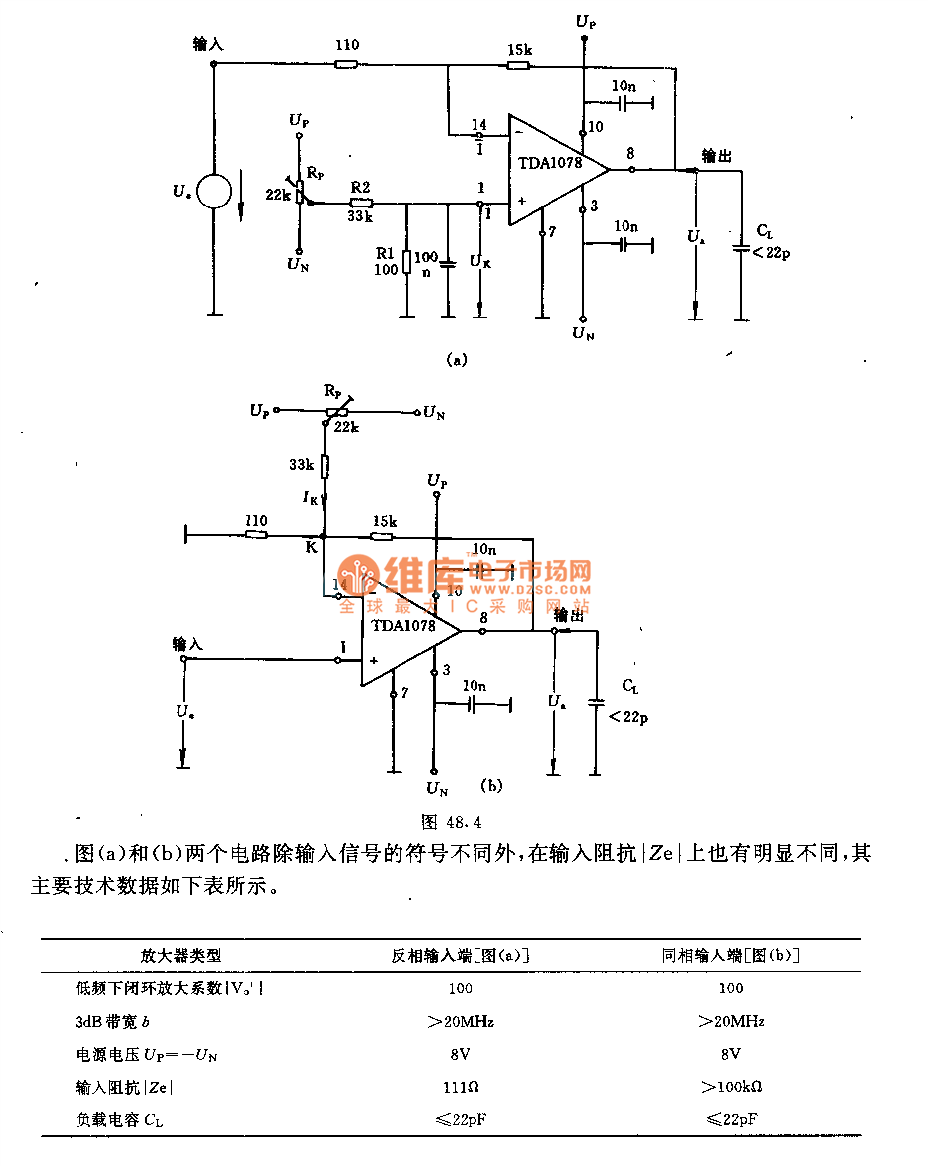 The circuits shown in Figures a and b have different signs of the input signal and input impedance Ze, and the main technical data is shown in the following table.