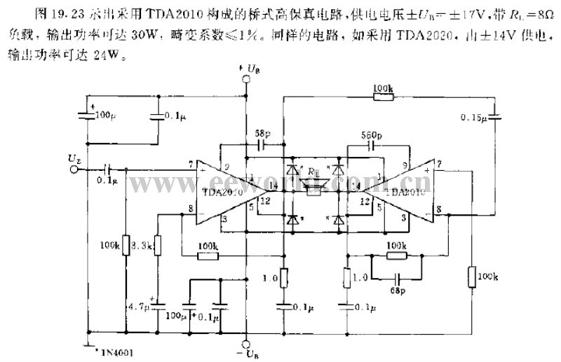 Figure 19.23 shows bridge high-fidelity circuit with TDA2010, and the supply voltage ± UB = ± 17V, load RL = 8Ω, output power can be up to 30W, the distortion coefficient ≤ 1 % . If the same circuit uses TDA2020, ± 14V power supply, the output power can be up to 24W.