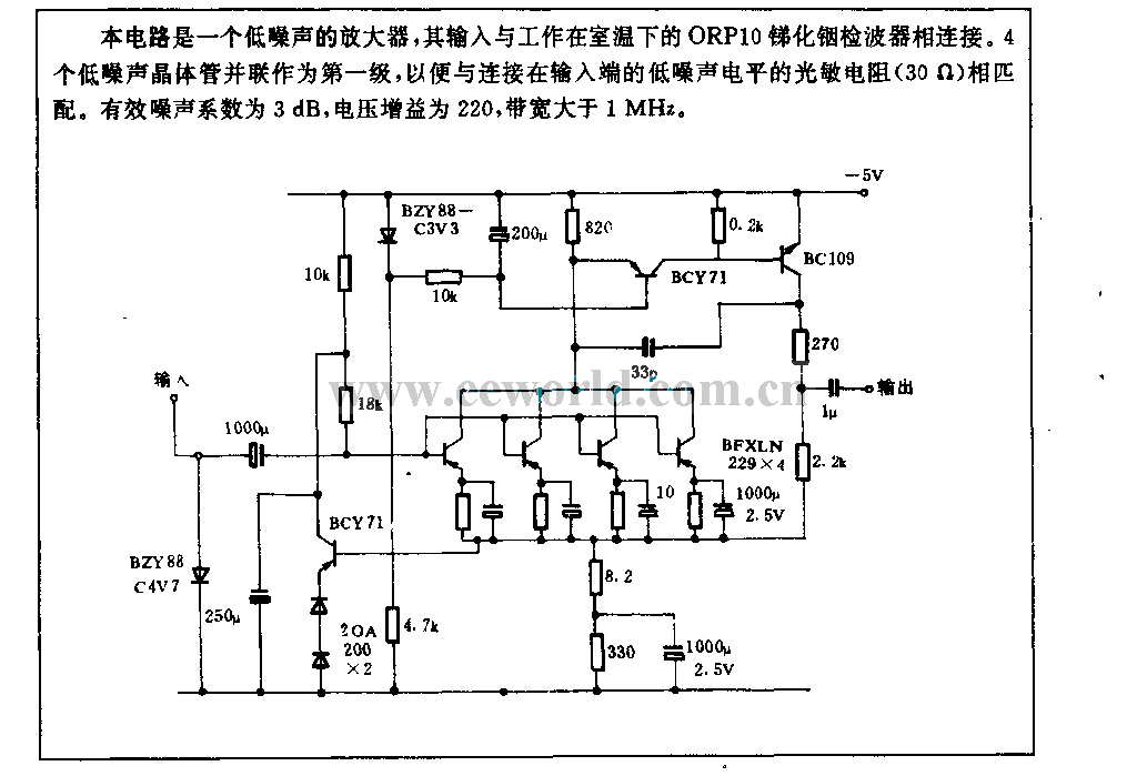 This circuit is a low-noise amplifier, its input isconnected with ORP10 lndium antimonide detector workingunder room temperature . Four low noise transistors are connected inparallelfor thefirst step in order to match with low noise level photoresistor (30Ω) connected in input end. Effective noise figure is 3dB, voltage gain is 220, bandwidth is above 1MHz.