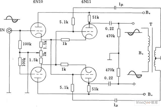 The electron tube crossing balance inverting phase circuit is also called Zell inverting phase circuit, in which 6N10 and 611 can be used as the pre-amplifier and phase inverter, and the circuit can be connected with the rear-end power amplifier tube installed with 300B.