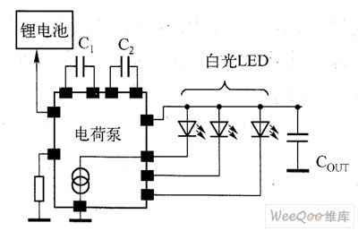 The electric charge is fixed with capacitors as the storage elements, and it doesn't need any external inductors, so the electromagnetic disturbance problem doesn't exist. Besides, the whole resolution takes little PCB coverage, but the efficiency is low. As the flashlight working time is short, which is about 100~300ms, so its efficiency has little effect on the battery lifespan. In figure 2 is the application circuit of the electric charge pump standard white light LED.