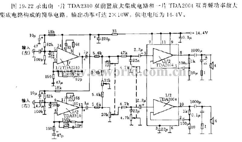 In Figure 19-22 is a simple circuit which consists of a TDA2310 dual preamplifier integrated circuit and a TDA2004 dual-audio power amplifier. The output power may reach 2*10W, and the supply voltage is 14.4V.