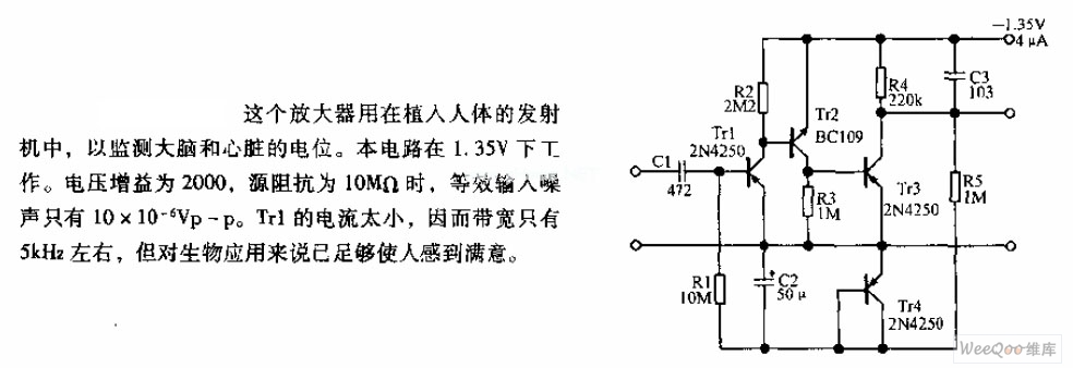 The amplifier is used in the emitter which is implanted in human bodies, so the LEV of the brain and heart can be monitored. The circuit works when the voltage is lower than 1.35V. The voltage gain is 2000, when the source impedance is 10MΩ, the equivalent input noise is only 10*10 -6Vp-p. The current of Trl is too low, so the band width is only 5kHz or so, but it is enough for biological use.