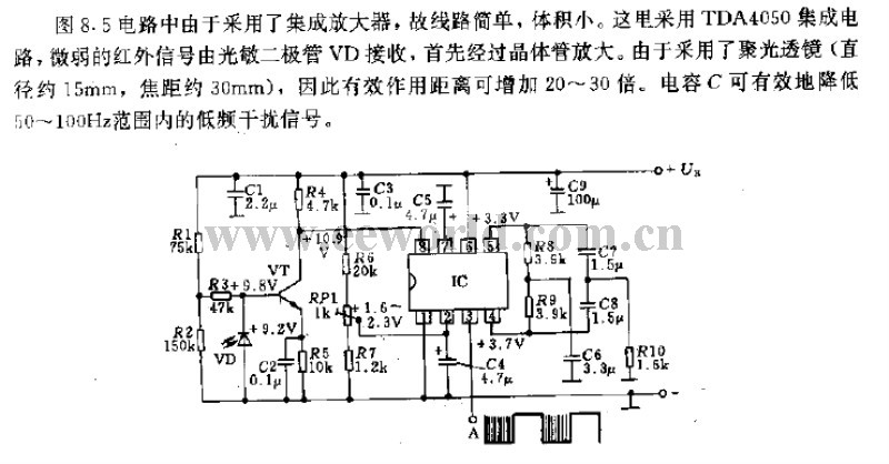 Because of the integrated amplifier, the circuit in Figure 8.5 is simple and small-sized. It is fixed with a TDA4050 integrated circuit, the weak infrared signal is received by the light dependent diode VD, and the signal is magnified by the NPN firstly. As the condensing (of which the diameter is about 15mm, and the focal length is about 30mm)lens is used here, the effective distance is increased to 20-30 times more than the former. The capacitor C can effectively reduce the low-frequency noise signal in the range of 50-100HZ.
