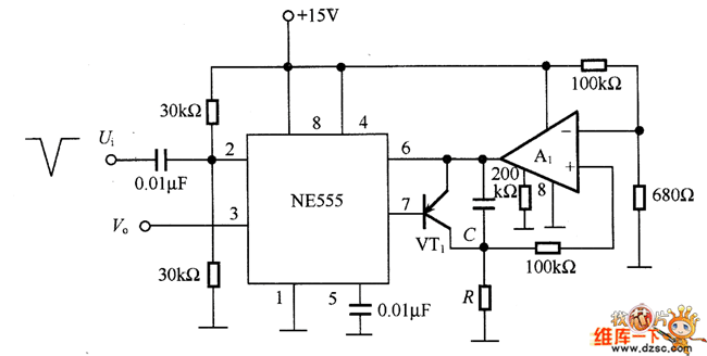 In the figure is the long-timing circuit of NE555. In the circuit, NE555 outputs a high LEV after it is triggered and the transistor in 7-pin is broken down. The integrator engages in linear integration to the reference voltage Uref generated by the resistor voltage, the integration output is rising along the line of Uref/(RC), the 6-pin trigger spot is (2/3)Ucc=10V. If Uref=0.1V, the delayed time that the threshold value UTH of NE555 rises to 10V is 100RC. When it reaches 2/3Ucc, the trigger in NE555 is reversing and the output of 3-pin is turning into a low LEV from a high LEV.