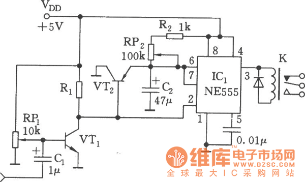 See as the figure, the circuit consists of the sound detection circuit and single steady trigger circuit, the relay is the executing component. VT1 finish the magnifying job of the input audio signal, when signals come, the 555 is reset, K is pulling in, VT2 is conducting, the electricity on C2 is released by the discharging tube and VT2 in 555. After the sound is gone, both VT1 and VT2 are blocked, C2 charges them through R2 and RP2, the contemporary stable time of the single stable circuit is td =1.1(R2+RP2)C2, the delaying time is 0.05~0.5S which can be adjusted by RP2.