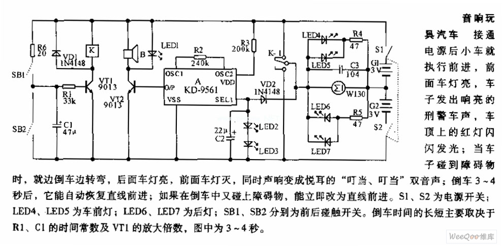The stereo toy car circuit After the power is on, the toy car is running forward, the front light is glowing, the car is making the police car sound, and the red light on the top of the car is flashing; when the car is touching the obstacle, it is making a turn and backing off, the rear light is glowing, the front light is put off, at the same time, the sound is changed into sweet ding-dong, ding-dong dual sound. After it is backing off for 3~4s, it will run forward again automatically; if it touches the obstacle while backing off, it will change the route and run forward immediately.