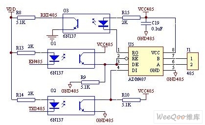 Used as a common communications interface devices, RS-485 / RS-422 chip can find corresponding models in many semiconductor companies, such as the ADI company ( device prefix is ADM).Most of the industrial RS-485 bus's customers should use the following circuit which connection is shown as the figure, this 485 circuit is mainly composed of 2 or 3 quick optocouplers,RS-485 transceiver device and isolating power supply module.Its advantages are simple connection and cheap price,its shortcomings are that using more device,big occupancy of the PCB area and thephotoelectric coupler is limited at the speed limit, power and LED aging.