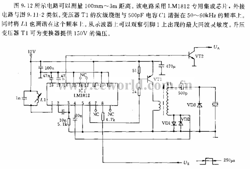 The circuit in Figure 9.12 can be used to measure the distance of 10mm~3m. This circuit is made of LM1812 special integrated chip, the external circuit is like the circuit in Figure 9.11-2, the secondary coil of transformer T and the 500pF capacitor of C1 are modulated in the frequency of 50~60kHZ, while L1 is also in it. From the oscilloscope, we can see the maximum echo sensitivity on 1-pin. The step-up transformer t1 can provide with a bias voltage of 150v for the matrix converter.