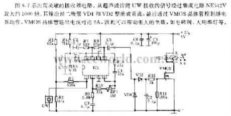 Figure 9.7 shows a receiver circuit of high sensitivity. The signals, which are received from the microphone UW, is magnified to 1000 times by NE542V. And the output is rectified by VD1 and VD2 into a DC, finally, it takes actions by the VMOS transistor controller. The output current of VMOS transistor can reach 2A. Therefore, large load can be driven, such as the magnetic valve, high-power light and so on.