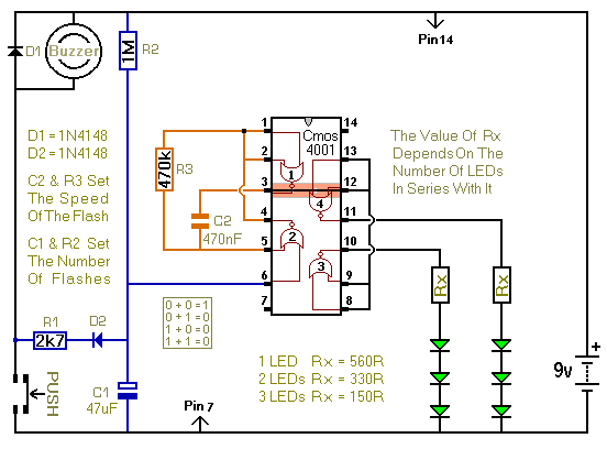 When the push switch is operated - the buzzer will sound and the LEDs will begin to flash. For the hearing members of the household - the buzzer acts as a regular doorbell. It also re-assures the visitor that the doorbell is working. When the push switch is released the buzzer will stop - but the LEDs will continue to flash. The length of time they will go on flashing is set by the values of R2 & C1. With the values shown in the diagram - the LEDs will flash for a further 30 seconds or so. If you make R2 a variable resistor, you can adjust the time period. If you want longer than 30 seconds - increase the value of C1 or R2.