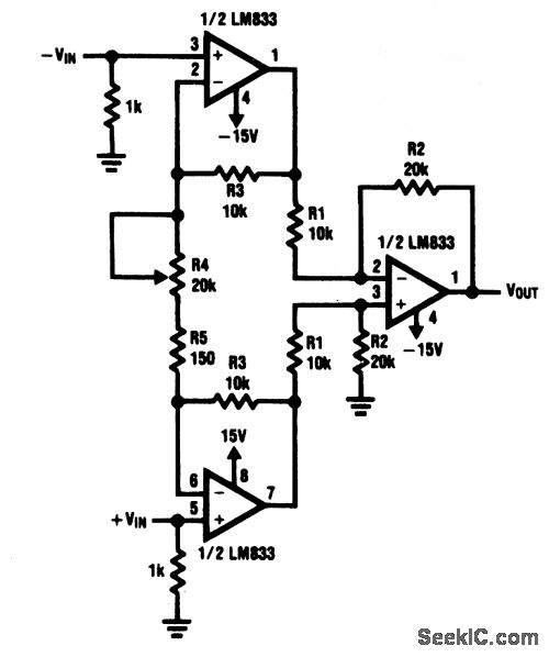 This circuit uses two LM833s to amplify the input signal before the common-mode noise is cancelled in the differential amplifier. The equivalent input noise is about 760 nV over a 20-Hz to 20-kHz frequency band (-122 dB referred to 1V), which is over 26 dB lower than a typical microphone output from the 30-dB SPL ambient noise level in a quiet room. THD is under 0.01% at maximum gain, and 0.002% at minimum gain. R4 adjusts the circuit gain from about 4 to 270.Common-mode noise is about 60 dB (or 44 dB, worst case) when R1, R2, and R3 are of 0.1 % tolerance. If better common-mode rejection is needed, one or the R2s can be replaced with an 18-kΩ resistor and a 5-kΩ, pot to trim for a better CMRR.If necessary, use 470-pF capacitors between inputs and ground to prevent RF interference from entering the preamp inputs.