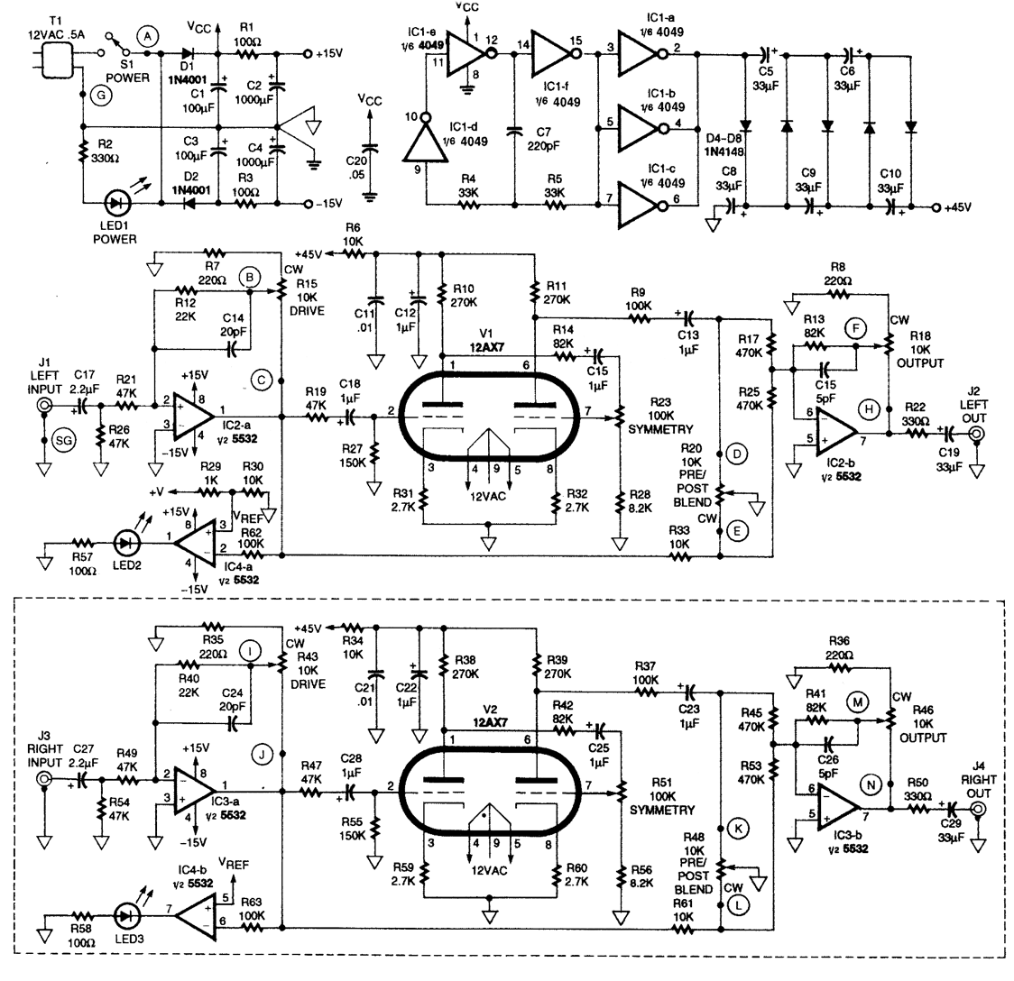 This schematic is for a tubehead amplifier. The output from transformer T1 is positive half-wave ac rectified by Dl and filtered by C1, C2, and RI for a +15-V supply. A -15-V supply is avail-able from D2, C3, C4, and R3. The plate supply for the 12AX7 tubes is produced by a voltage multi-plier.Some listeners prefer the sound of a vacuum tube audio system. Although this is rather subjective and a personal preference, this circuit can be used to simulate the tube sound preferred by these listeners.