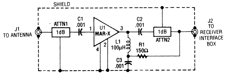 The MAR-x preamp shown will cover up to 1.5 or 2 GHz with the correct MAR-x IC. ATTN1 should be omitted for low noise-figure applications. ATTN1 and ATTN2 provide a means of lirniting possible termination range, for less chance of device instability.