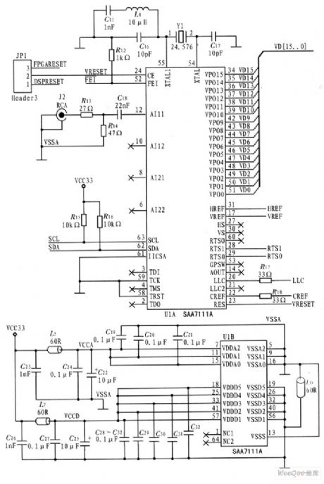 The video decoder this system uses is Philip company's high-performance video A/D converter SAA7111. The device is high-performance video input processor which is widely used in desktop video, multi-media, digital television, photo processing, visual telephone. It uses 3.3V CMOS circuit and highly integrated analog front end and digital video encoder which include two circuits of analog video processing channel, one clock generating circuit, one automatic clamp and gain control circuit, one multi system digital decoder, one brightness/contrast/saturation control circuit, and a color space matrix.