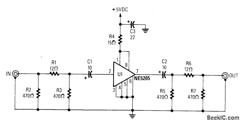 Using a Signetics NE5205, this circuit gives about + 16-dB gain from LF to 600 MHz. The π mini-mizes load impedance and source-impedance variations and aids stability.