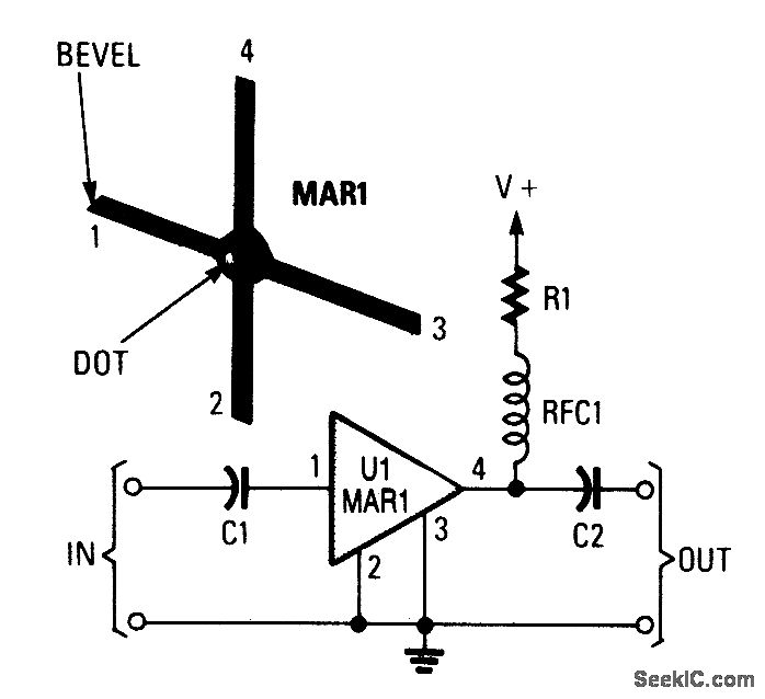 This wideband amplifier uses a MARI IC, which is a gain block. The device is manufactured by Mini-Circuits Lab and offers +13-dB gain from dc to 1000 MHz. R1 is selected to provide 17-mA current to UI at +5 V. For 12-V supply R1 = 470 Ω. RFC1 is typically 1 to 5 pH.