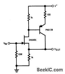 Low input capacitance of 2N5485 FET makes compound series-feedback buffer serve as wideband unity-gain amplifier having high input impedance.- FET Data-book, National Semiconductor, Santa Clara,CA,1977, p 6-26-6-36.
